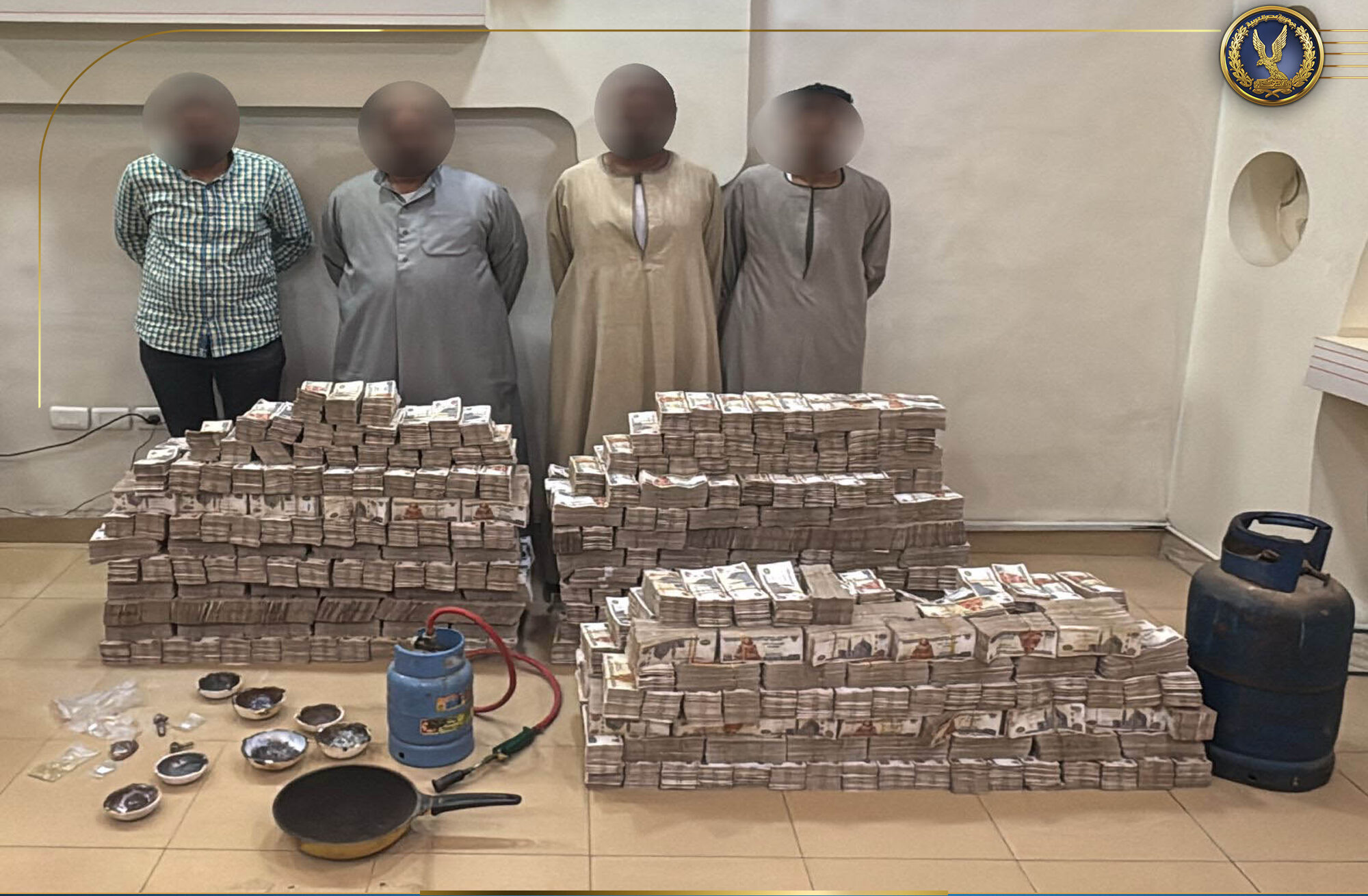 وبعد تقنين الإجراءات، نجحت قوات الأمن في ضبط المتهمين وبحوزتهم مبالغ مالية كبيرة، وكمية من أحجار الكوارتز، وقطعة معدنية يُشتبه في كونها من الذهب، إلى جانب أدوات تُستخدم في عمليات سبك الذهب، وكمية من خام الذهب المستخرج بطرق غير مشروعة.