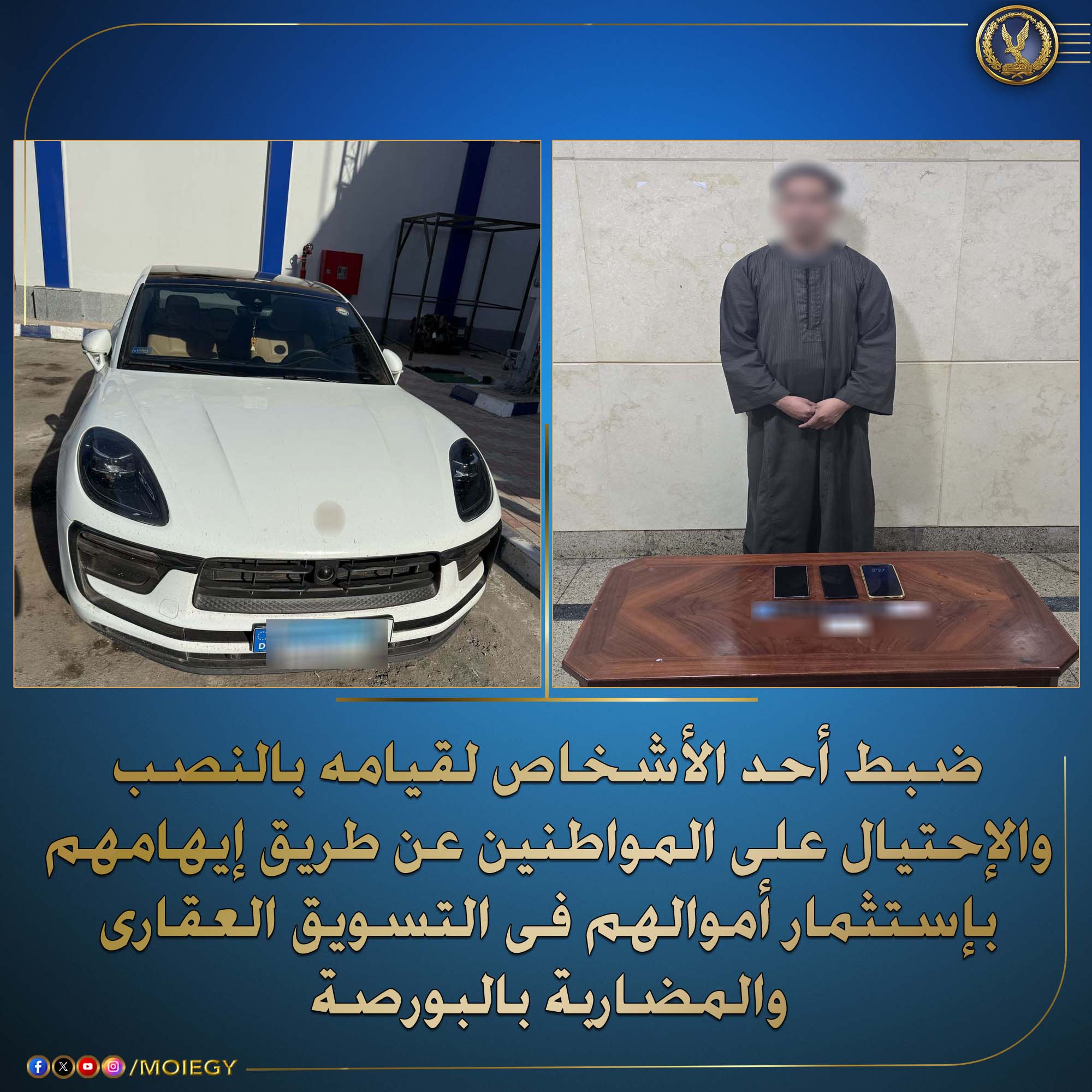 نجحت الأجهزة الأمنية في ضبط أحد الأشخاص لقيامه بعمليات نصب واحتيال على المواطنين، بعدما أوهمهم بإمكانية استثمار أموالهم في مجال التسويق العقاري والمضاربة في البورصة، مستغلاً وسائل التواصل الاجتماعي في الترويج لأنشطته الإجرامية.