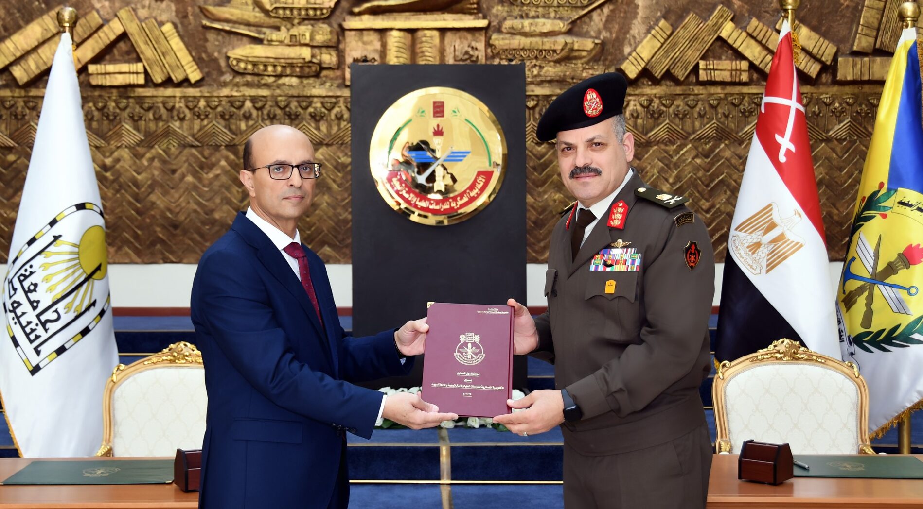 فى إطار حرص القوات المسلحة على تبادل الخبرات العلمية ودعم الأنشطة البحثية مع مختلف الجامعات المصرية ، وقع اللواء أ ح / عاطف عبد الرؤوف محمود مدير الأكاديمية العسكرية للدراسات العليا والإستراتيجية بروتوكول تعاون مع الأستاذ الدكتور / أحمد المنشاوى رئيس جامعة أسيوط .
