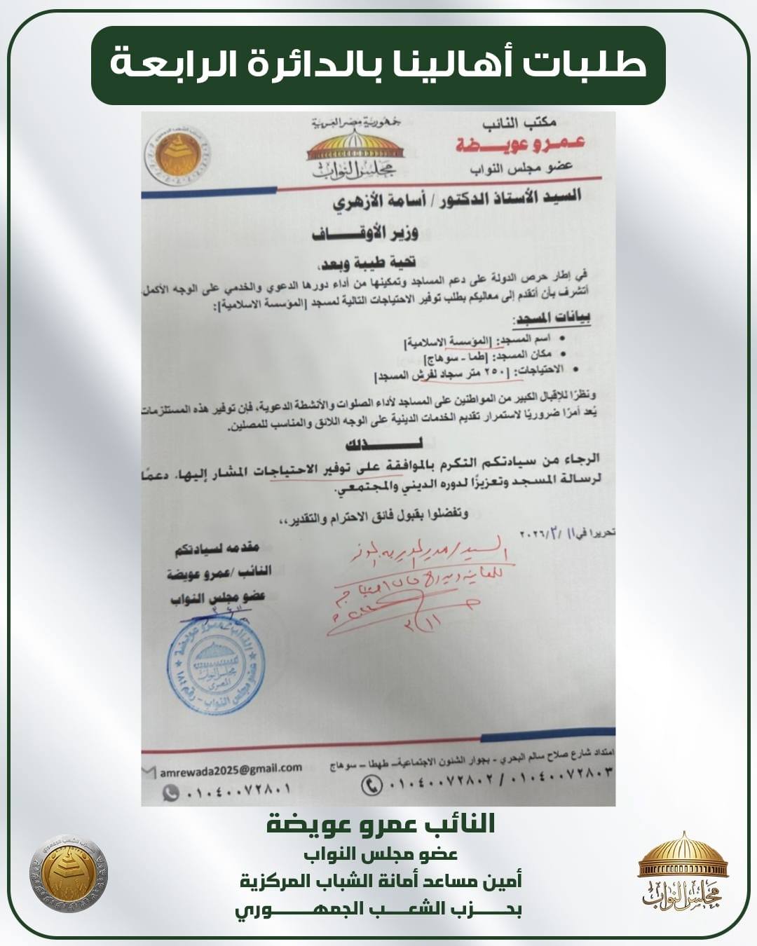 في غضون ذلك، استشهد النائب عمرو عويضة بالآية الكريمة: ﴿إِنَّمَا يَعْمُرُ مَسَاجِدَ اللَّهِ مَنْ آمَنَ بِاللَّهِ وَالْيَوْمِ الْآخِرِ﴾. وبالتالي، يعكس هذا التحرك التزام النائب بمسؤولياته الدينية والاجتماعية تجاه أهالي طما. كما شدد على أهمية الشفافية في عرض الخطوات التنفيذية التي يقوم بها لخدمة المواطنين.