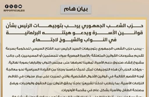 رحب حزب الشعب الجمهوري بتوجيهات الرئيس عبد الفتاح السيسي الأخيرة للحكومة. حيث وجه الرئيس بسرعة تقديم مشروعات قوانين الأسرة المصرية للمسلمين والمسيحيين.