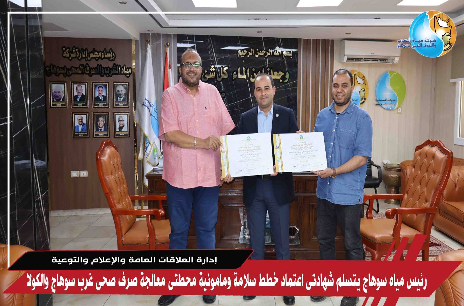 تسلم المهندس محمد صلاح الدين عبد الغفار رئيس مجلس ادارة شركة مياه الشرب والصرف الصحى بسوهاج والعضو المنتدب شهادتى اعتماد خطط سلامة ومامونية مياه الشرب لتوسعات محطة معالجة صرف صحى غرب سوهاج بمركز سوهاج والتى تبلغ طاقتها التصميمية 28 الف متر مكعب لكل يوم ومحطة معالجة صرف صحى الكولا بمركز اخميم والتى تبلغ طاقتها التصميمية 55 ألف متر مكعب لكل يوم.