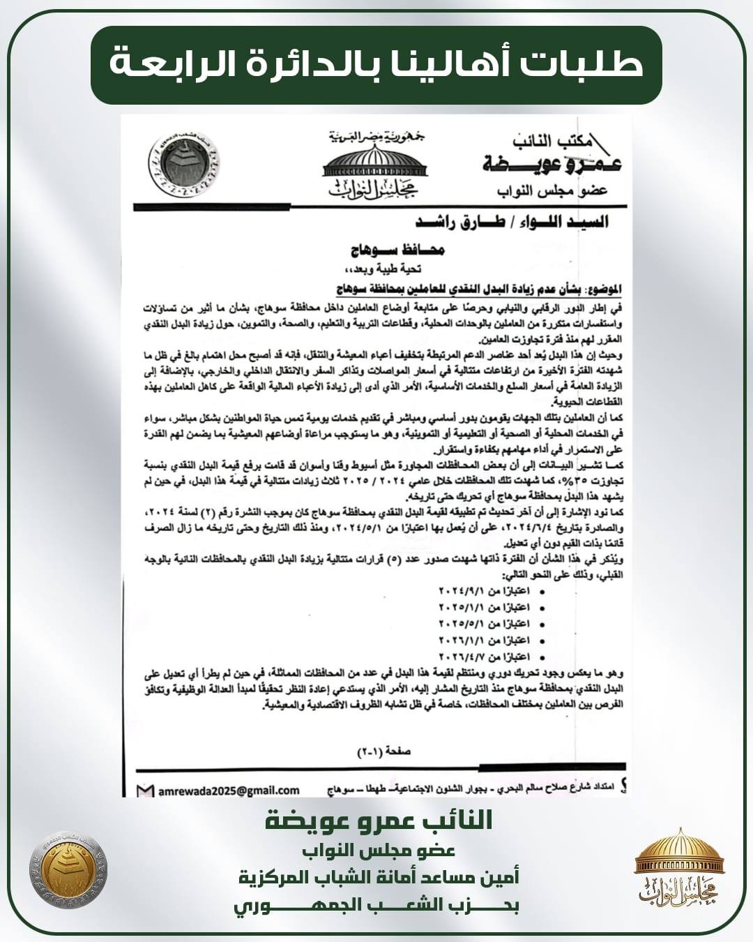 من أجل معالجة هذا الخلل، وجه النائب عمرو عويضة خطاباً رسمياً إلى اللواء طارق راشد، محافظ سوهاج. وقد تضمن الخطاب المطالب العاجلة التالية: