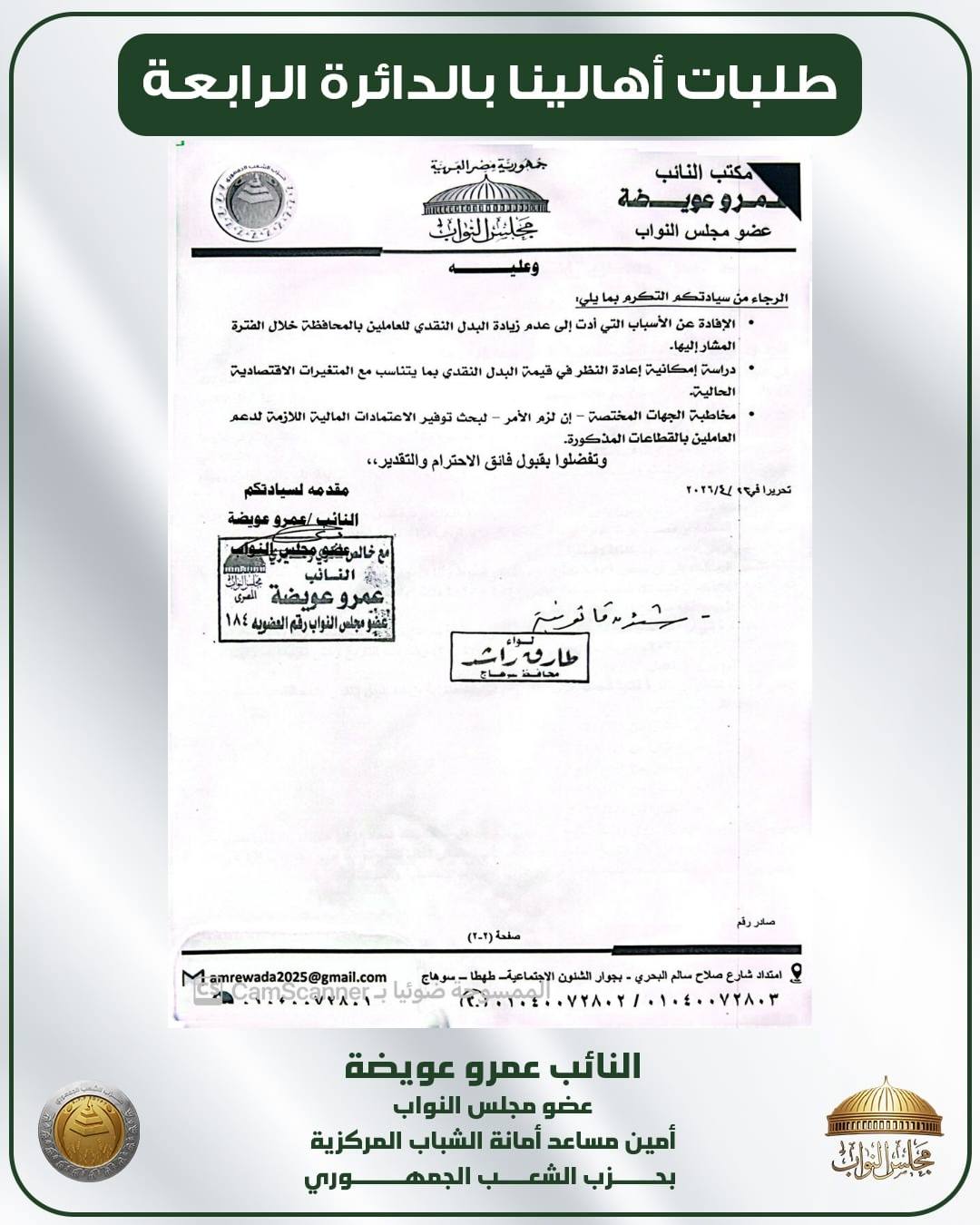 توضيح الأسباب: طلب النائب توضيحاً رسمياً حول أسباب عدم زيادة البدل النقدي في سوهاج حتى الآن.